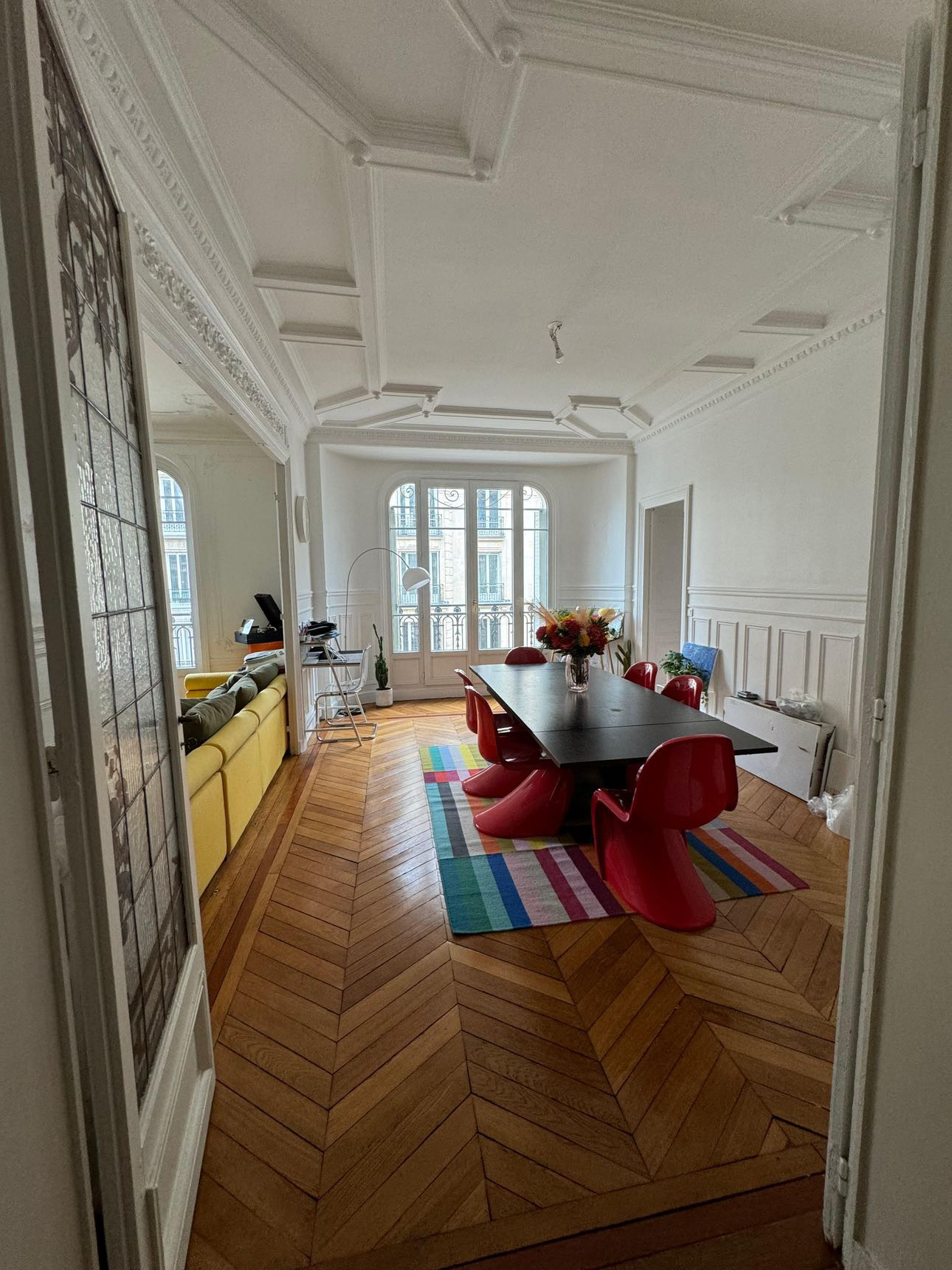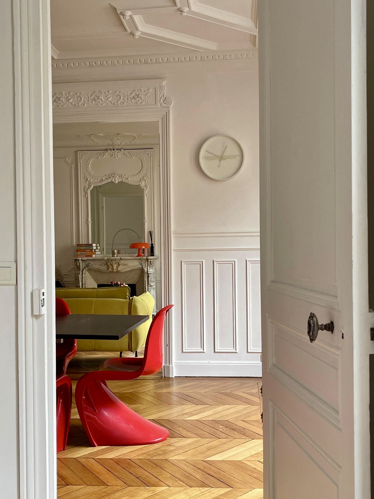 Les couleurs vives, les œuvres contemporaines et le mobilier design contrastent avec les moulures et le parquet en point de Hongrie.