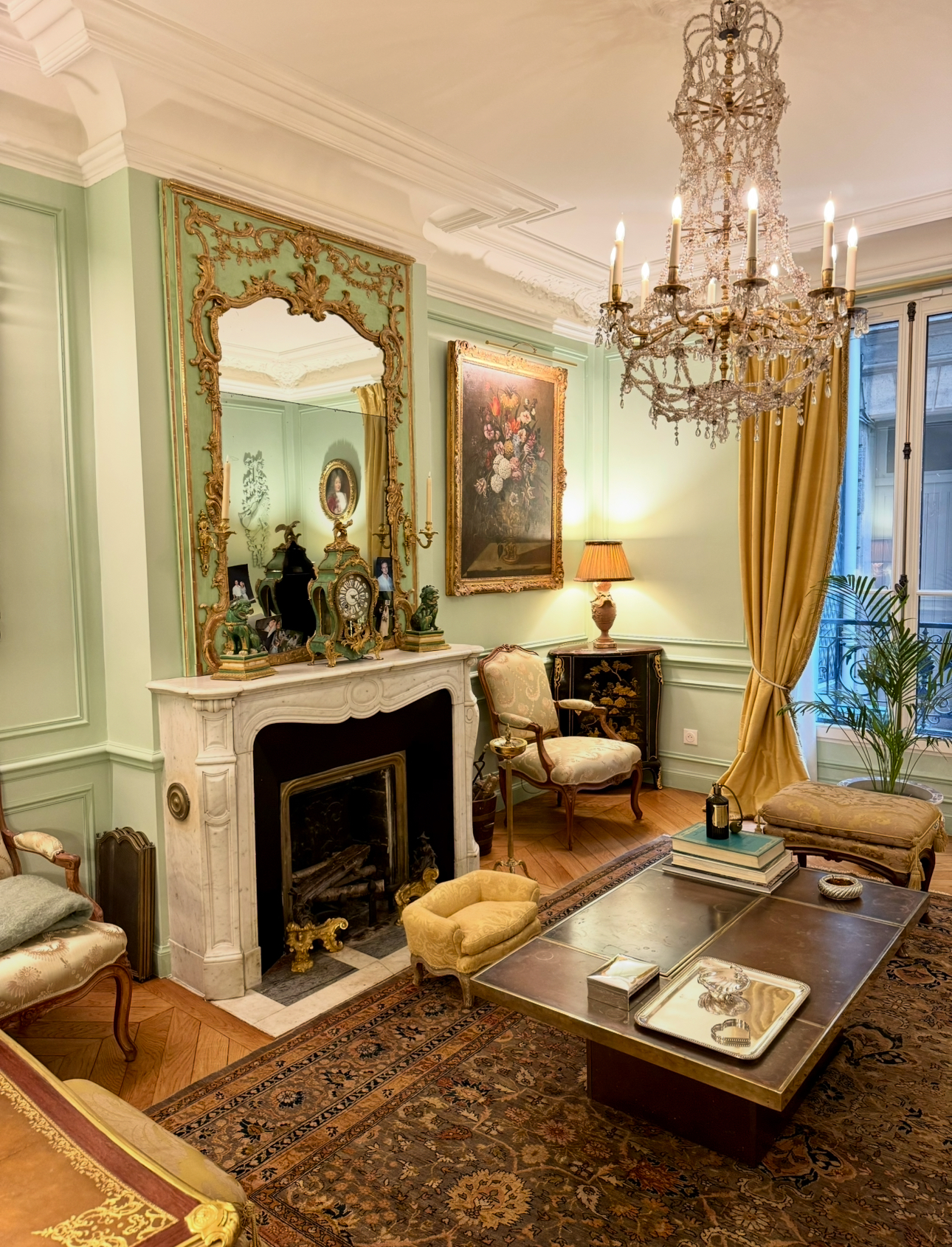 Dorures, moulures et mobilier à la Louis XV composent un décor somptueux au charme parisien intemporel.