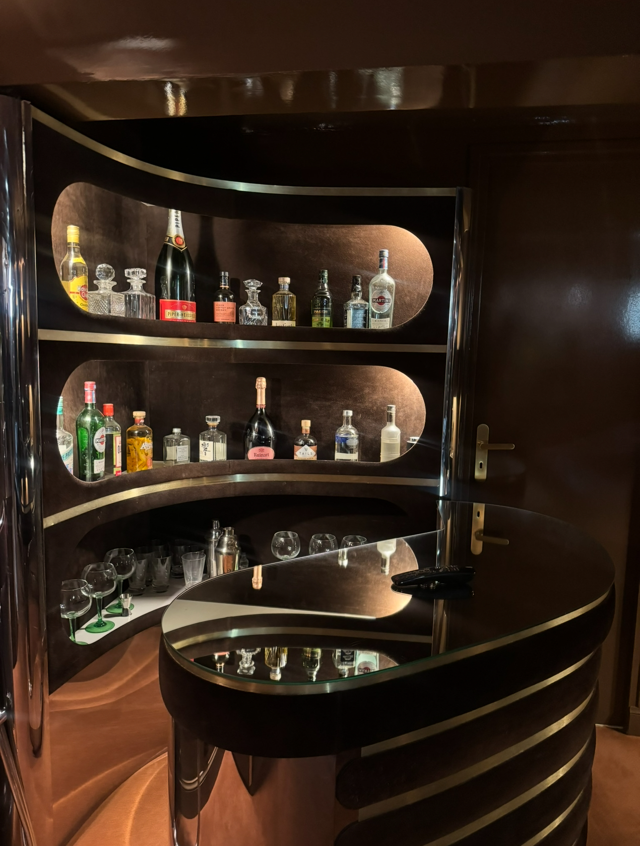 Un bar au sous-sol inspiré des années 70 apporte une touche rétro et cinématographique.